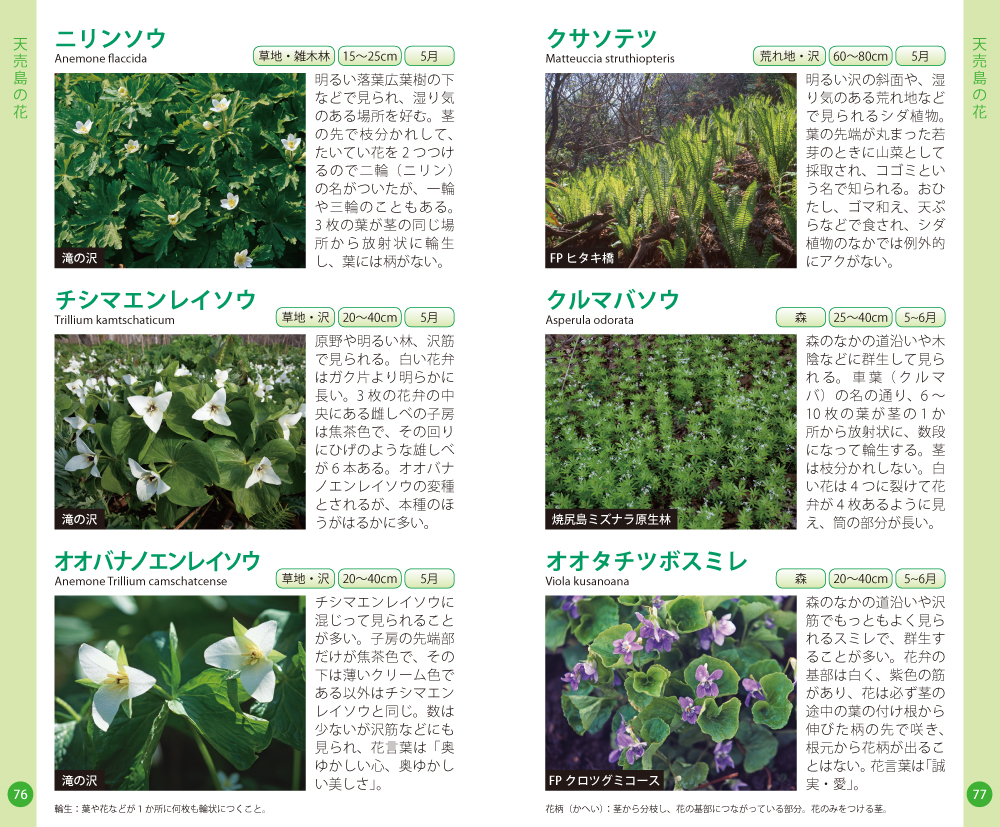 2つの島の観察ポイントを紹介。各ポイントのどの場所で、どんな鳥や花が見られるのかを詳しく解説。