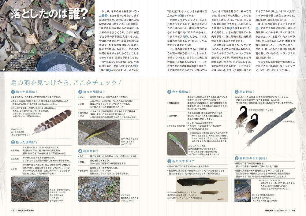 ふだんは上ばかり気にして歩くフィールドを、地面に注意しながら歩いたことはあるだろうか?その気になって探してみると、そこここで見つかる鳥の羽。落とした鳥の名前や、その状況を推理するのも、バードウォッチングの楽しみの一つだ。本特集では、各羽の名称とその役割や、部位の見分け方、羽が生えるしくみ、そして、拾った羽の見分け方を紹介する。