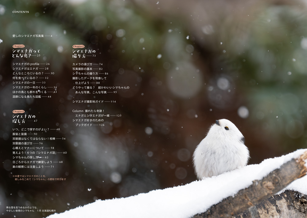 大人気のシマエナガを見つけて撮影するためのノウハウを満載。シマエナガの詳しい生態と、4つの「シマエナガ語」やシルエット、動き方など実践的な探し方を紹介。シマエナガの動きに合わせた撮り方に加え、撮影したデータの仕上げ方(現像方法)まで徹底解説。