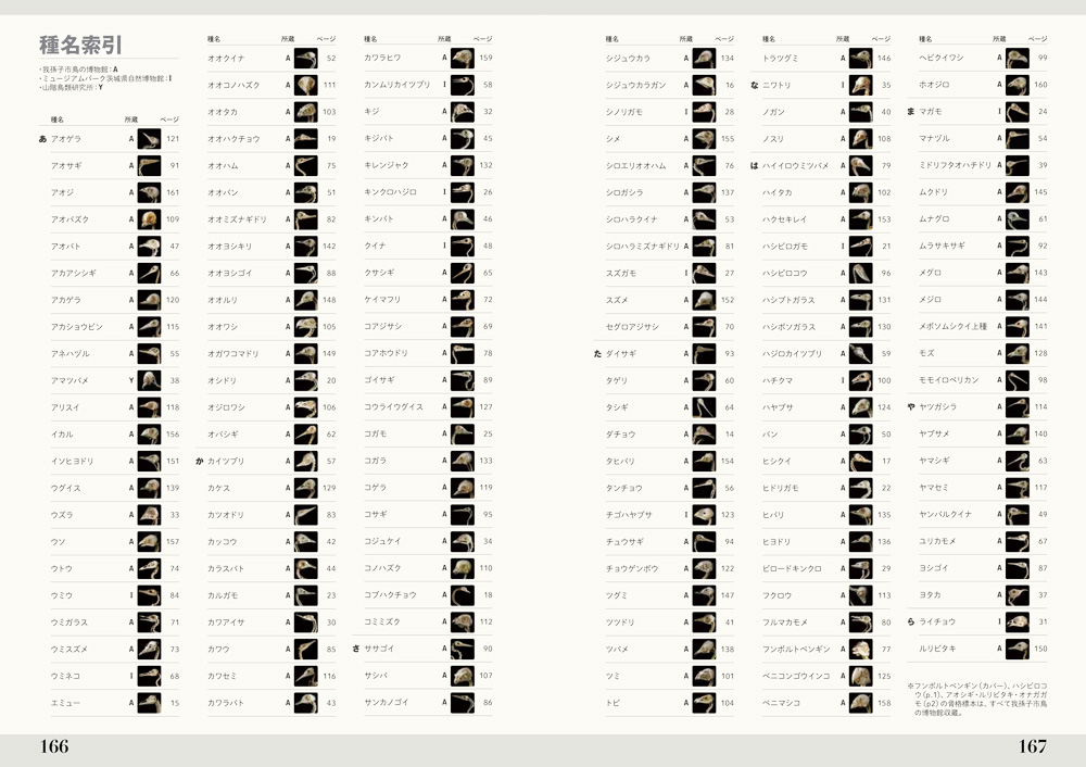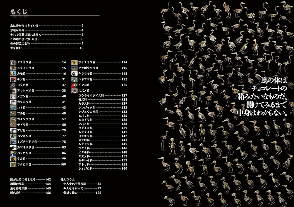 - 鳥の骨格標本のほか、その鳥の生態を特徴づけるイチ押しの骨も掲載