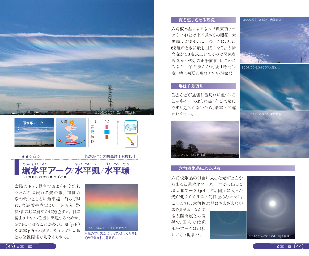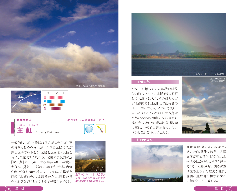 空の虹色を探そう/どうして虹色になる?/光の性質「屈折」と「反射」/空の青色、雲の白色/雲の種類とできる高さ/雲の種類と特徴/よく見られる大気光学現/どこに見える?/用語解説/主要な大気光学現象の見分け方/図鑑の使い方