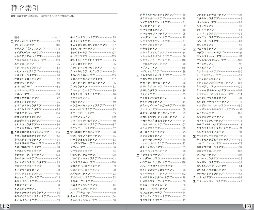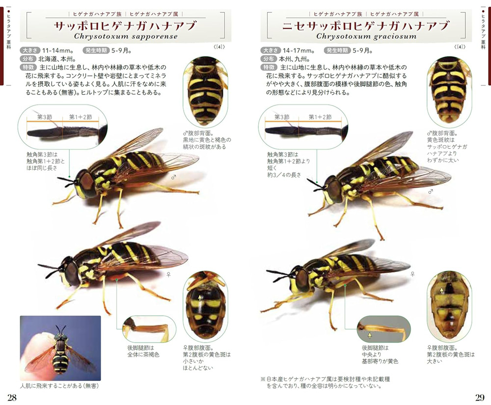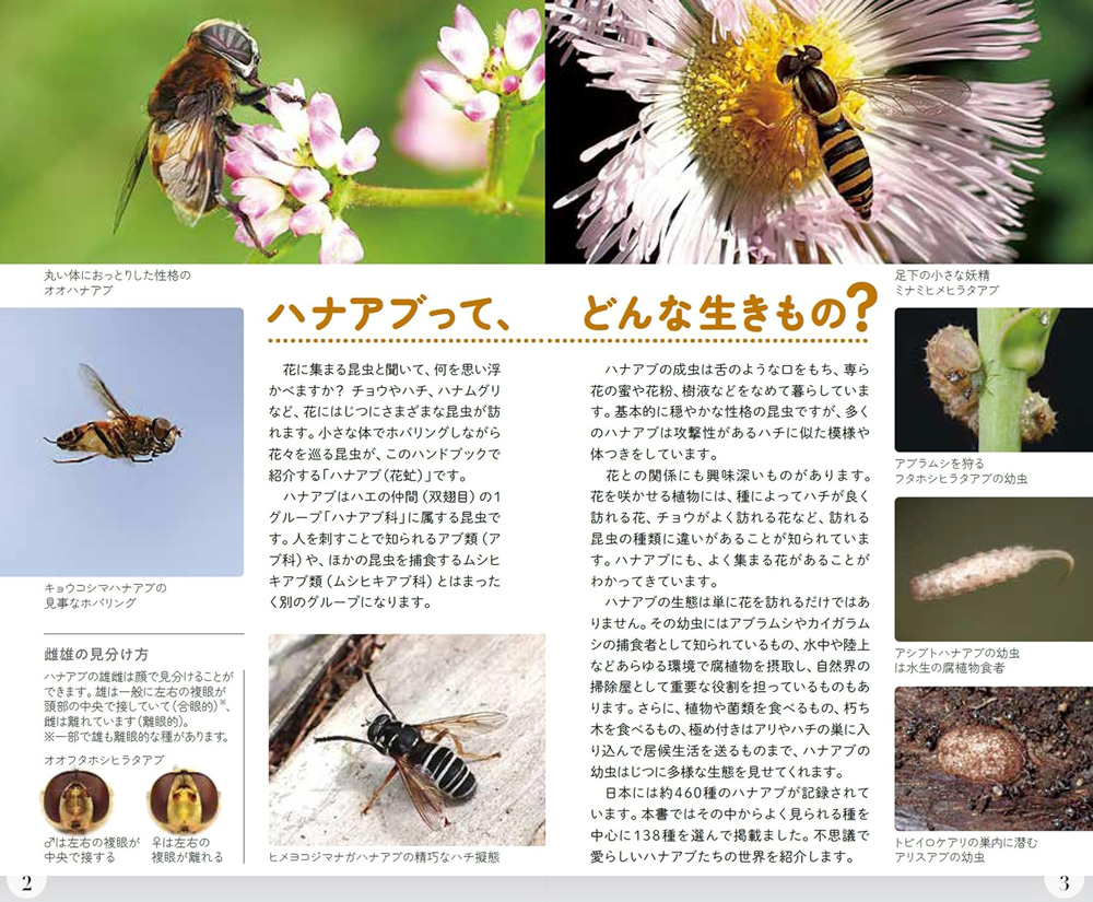 - 日本で記録されている約460種のハナアブ科のうち、よく見られる138種を中心に掲載。